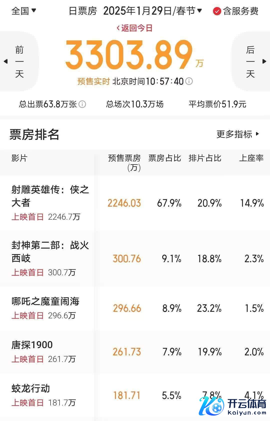 在《射雕》和《哪吒之魔童闹海》之间,位列第二的即是本年春节档资本最高的史诗级大片《封神第二部》,据了解该片的总资要开头了10亿东说念主民币,至少需要得益近40亿东说念主民币的票房智商够相差均衡。可该片的最高瞻望票房却唯有30亿东说念主民币,它目下的预售票房则冲破了300万东说念主民币,仅次于《射雕》。