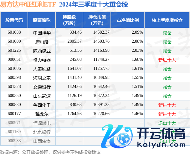 易方达中证红利ETF为指数型-股票基金,凭据最新一期基金季报表现,该基金钞票竖立:股票占净值比99.88%,无债券类钞票,现款占净值比0.2%。基金十大重仓股如下: