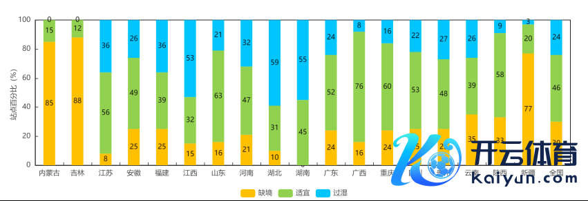 附图2 2月22日分省20厘米泥土墒情统计(站点百分比)