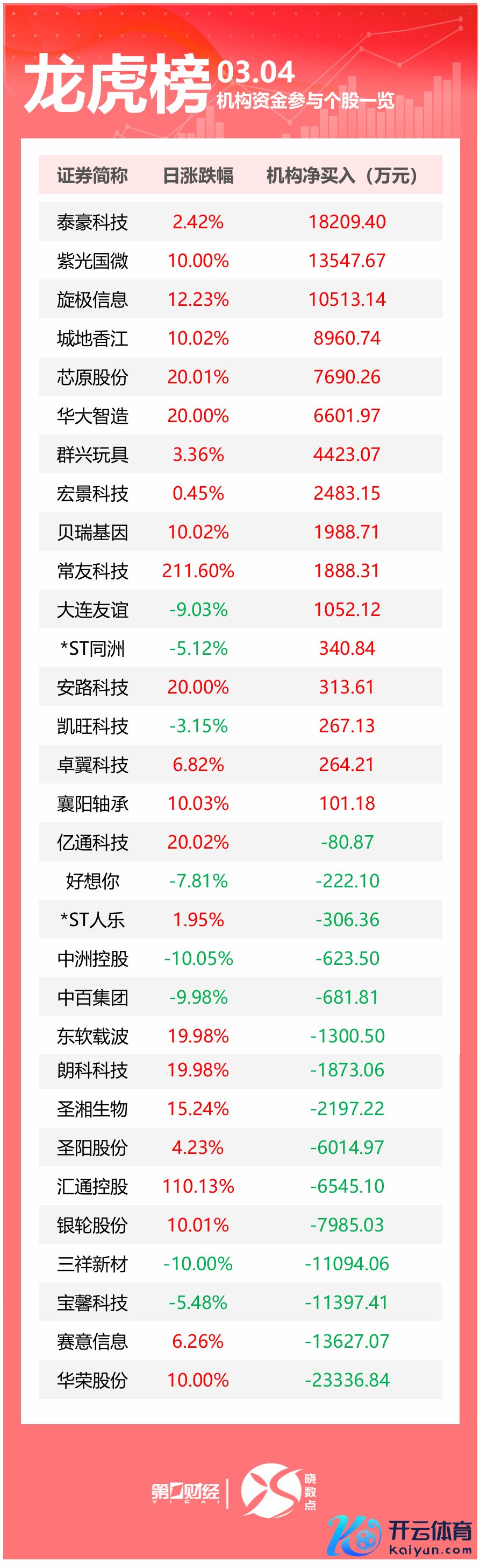 盘后数据清晰,3月4日龙虎榜中,共31只个股出现了机构的身影,16只股票呈现机构净买入欧洲杯体育,15只股票呈现机构净卖出。