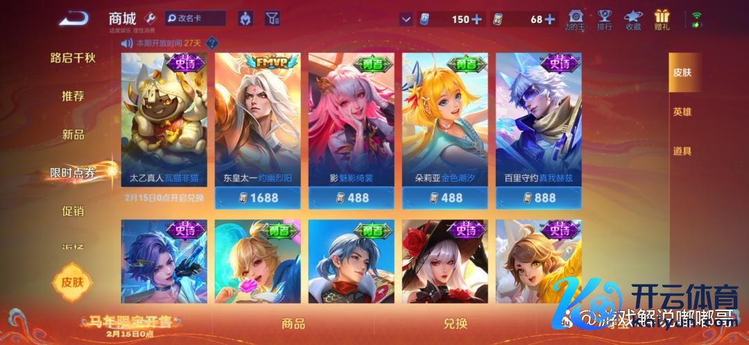 王者荣耀春节版块活动正在进行中,而“小王送福”福利活动亦然普遍开启了,该活动还是眩惑百万玩家记忆,因为不错白嫖皮肤,不知谈群众在帝天的小王送福活动中拿到了几等奖,不少玩家亦然拿到四等奖的888限时点券,等于是一款史诗级皮肤平直了,这期就给群众说一下,限时点券商城开启,聪惠玩家优先兑换这三款,终末一款值1颗荣耀水晶。