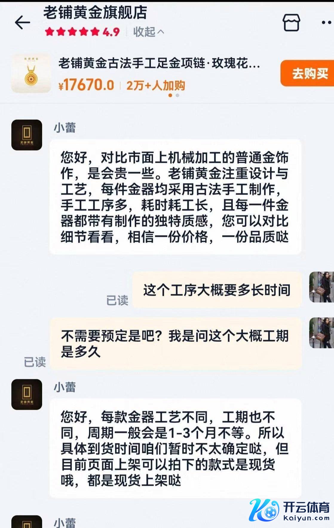 “现在饰品把件类全是一口价,每件均领受古法手工工艺,周期在1-3个月不等,其质感惟一无二,价钱当然比机械加工的庸碌金饰要贵。”当记者商议一款克重均价为何高达2265元的玫瑰花窗钻石嵌入吊坠时,老铺黄金天猫客服这么诠释。