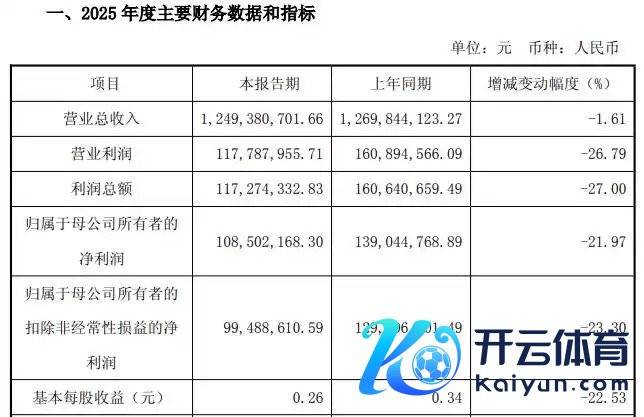 功绩方面,2025年度,公司已矣营业收入12.49亿元,同比着落1.61%;归母净利润为1.09亿元,同比着落21.97%;扣非净利润为9948.86万元,同比着落23.30%。