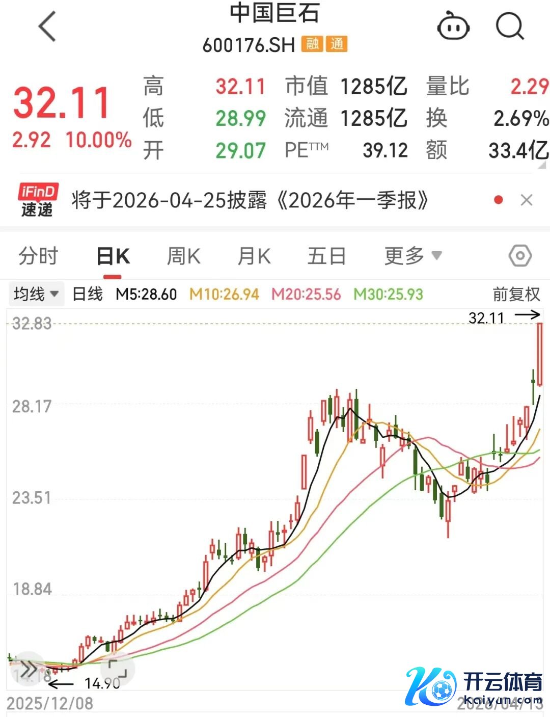 本日(4月13日)早盘,中国巨石(600176)低开高走,舍弃上昼收盘,股价涨停,涨停板封单27.22万手,最新股价创历史新高,A股市值达到1285亿元。