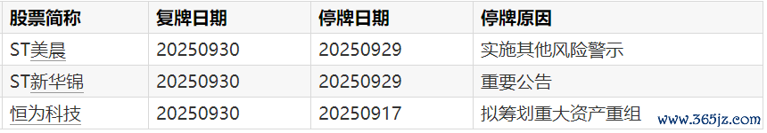 A股分成派息转增一览(9月30日):3股本日股权登记